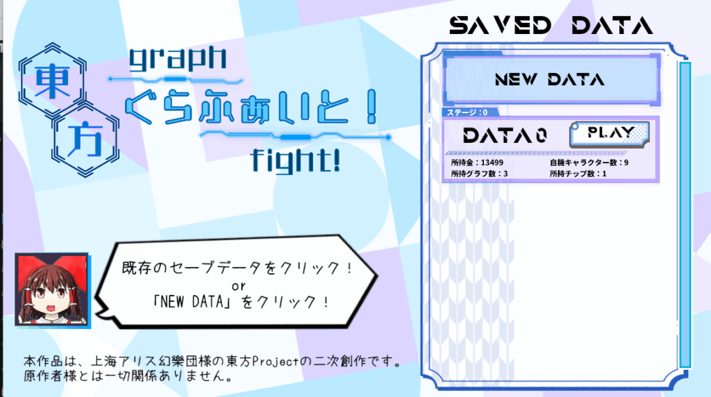 ・既存のデータの「PLAY」をクリックするとそのデータでゲームを開始します。