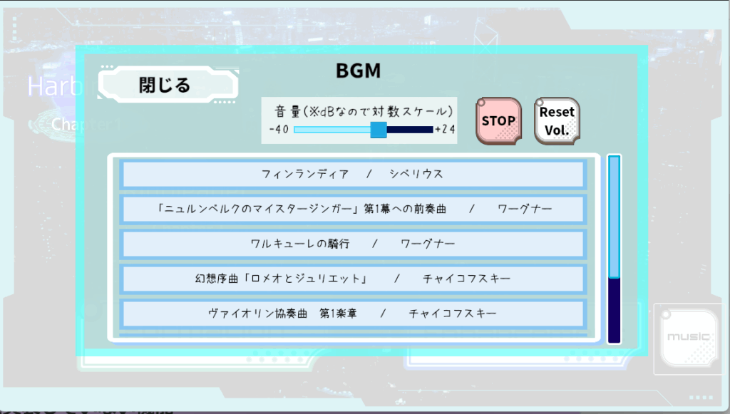 ・「閉じる」または周辺をクリックするとBGM設定を閉じます。