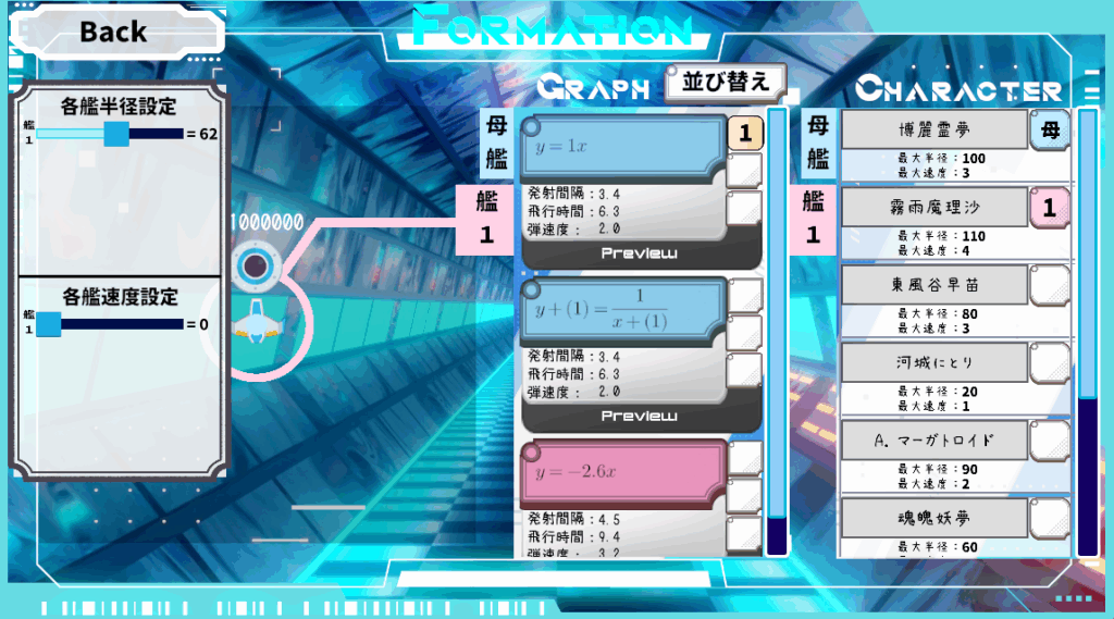 ・「各艦半径設定」「各艦速度設定」のスライダー(艦にキャラクターが載っていないと表示されません)で、それぞれの子艦(母艦の周りをまわります)の半径と速度が変えられます。