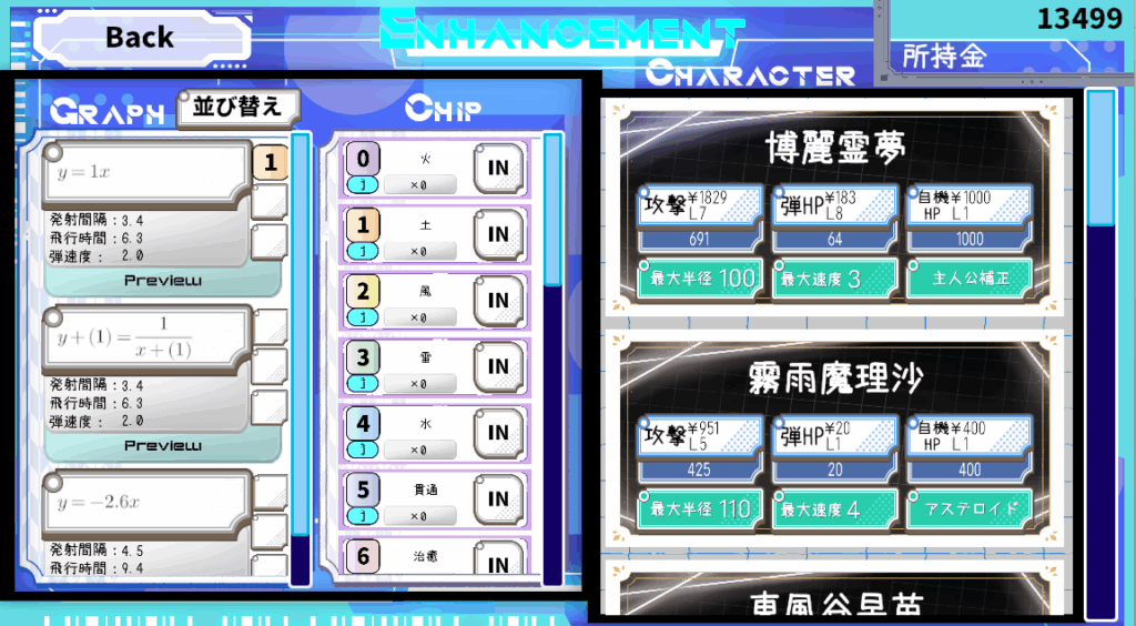 それぞれのキャラの攻撃・弾HP・自機HPはお金を払うことで上昇させることができます。